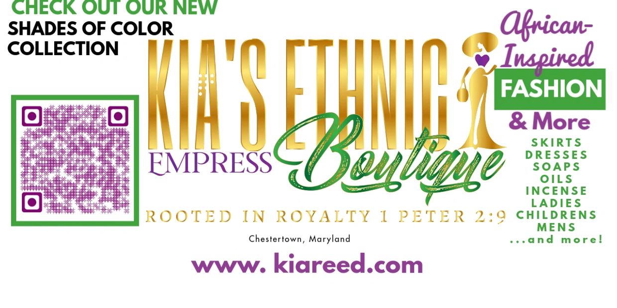 Whether you're looking to expand your personal wardrobe or take your home to the next level, Elder Kia Reed's Ethnic Empress Boutique is here for you! We are a POP-UP Boutique offering African Inspired Apparel, oils, soaps, and more! Just added the Shades of Color Collection!